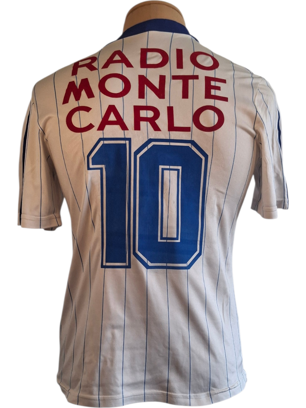 Maillot blanc à rayures bleues claires, époque post-Bossi où l’OM cherche un second souffle avant l’ère Tapie.