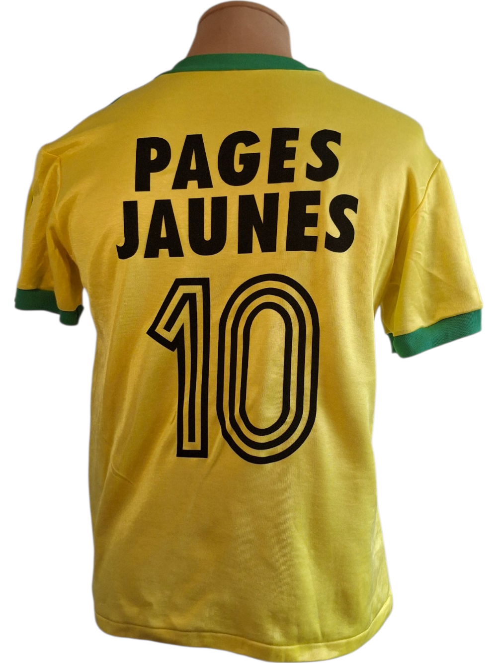 Maillot exterieur jaune intense avec touches vertes, sponsor Pages Jaunes plus grand que nature, emblème du jeu à la nantaise sous la houlette de Henri Michel et Maxime Bossis.